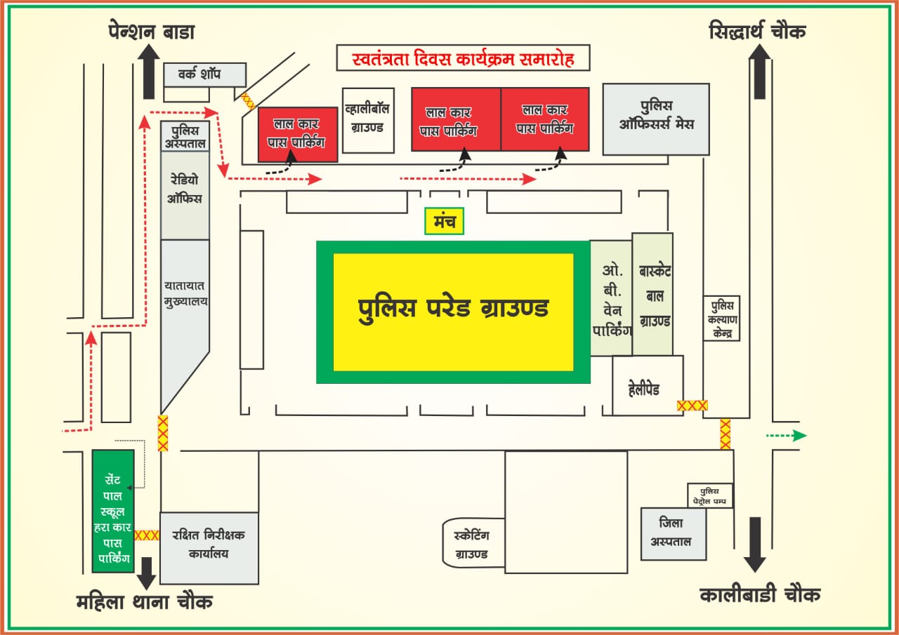 रायपुर। राजधानी पुलिस परेड मैदान में आयोजित किये जाने वाले स्वतंत्रता दिवस कार्यक्रम में पहुंचने के लिए रायपुर पुलिस ने रोड मैप जारी कर दिया है परेड ग्राउंड में परेड एवं स्कूली छात्र- छात्राओं का आकर्षक कार्यक्रम होगा, कार्यक्रम में सम्मिलित होने शहर के छात्र-छात्रा, आमंत्रित विशिष्ट नागरिकों के अतिरिक्त आम नागरिकों का काफी भीड़ होने की संभावना है , स्वतंत्रता दिवस समारोह में सम्मिलित होने एवं देखने आने वाले आगंतुकों के वाहनों के लिए मार्ग एवं पार्किंग व्यवस्था निम्नानुसार किया गया है।