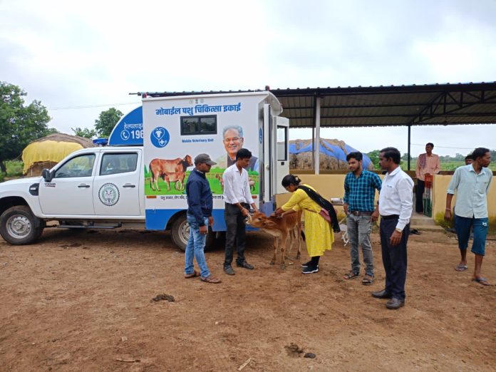 रायपुर। छत्तीसगढ़ में इंसानों ही नहीं बल्कि पशुओं और गौवंश की सेहत का भी पूरा ध्यान रखा जा रहा है। मुख्यमंत्री भूपेश बघेल के नेतृत्व में पशुओं के घर पहंुच ईलाज के लिए गौवंश मोबाईल चिकित्सा यूनिट शुरू की गई है। राज्य के नागरिकों के लिए शुरू की गई मुख्यमंत्री हाट-बाजार क्लिनिक योजना और मुख्यमंत्री शहरी स्लम स्वास्थ्य योजना की तर्ज पर अब ईलाज की घर पहुंच सेवा पशुओं के लिए भी दी जा रही है। रायपुर जिले के चारो विकासखण्डों के लिए एक-एक सुसज्जित मोबाईल वेटनरी यूनिट सक्रिय हो गई है। तिल्दा विकासखण्ड के कोदवा गांव पहुंचकर डाॅ. ललित कुमार साहू ने इस यूनिट से गौवंशीय पशुओं का ईलाज किया वहीं आरंग विकासखण्ड के पारागांव गौठान में मोबाईल यूनिट के माध्यम से पशुओं का स्वास्थ्य परीक्षण किया गया। मुख्यमंत्री श्री भूपेश बघेल ने 20 अगस्त को ही ऐसी 163 मोबाईल वेटनरी यूनिटों का शुभारंभ किया है। अब जिले के कोई भी पशुपालक अपने पशुओं के बीमार होने पर इस मोबाईल वेटनरी यूनिट को अपने घर तक भी बुला सकेंगे और पशुओं का समय पर ईलाज करा सकेंगे।